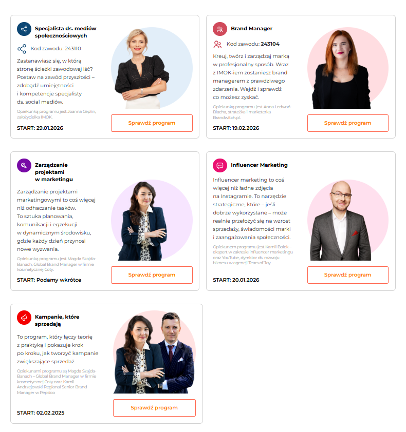 Instytut Marki Online i Komunikacji (IMOK) to nowoczesna placówka edukacyjna skoncentrowana na praktycznych szkoleniach z zakresu marketingu, komunikacji online, mediów społecznościowych, sztucznej inteligencji oraz budowania marki. Instytut działa w formule szkoleń online na żywo, które prowadzą doświadczeni praktycy i eksperci z branży, co daje uczestnikom realne umiejętności możliwe do zastosowania od razu w pracy zawodowej lub biznesie.