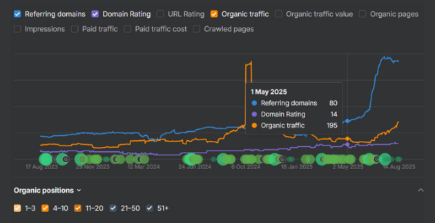 Prowadzę kompleksowe działania SEO dla sklepu internetowego z branży motoryzacyjnej (SEO na rynek USA, projekt trwa od maja 2025 r.). Zarządzam stroną w pełnym zakresie – od optymalizacji technicznej po contentową. Nadzorowałam migrację witryny do nowego szablonu, dbając o prawidłowe przeniesienie treści, strukturę linków i zachowanie dotychczasowych wyników SEO. Przygotowałam strategię treści oraz content plan dla bloga, a także samodzielnie napisałam artykuły wspierające pozycjonowanie i sprzedaż. Regularnie monitoruję efekty, wprowadzam niezbędne optymalizacje i rozwijam stronę, aby zapewnić jej wysoką wydajność, lepszą widoczność w Google i większą liczbę konwersji. Jak widać na załączonym screenie, w ciągu 3 miesięcy współpracy ruch organiczny wzrósł dwukrotnie.